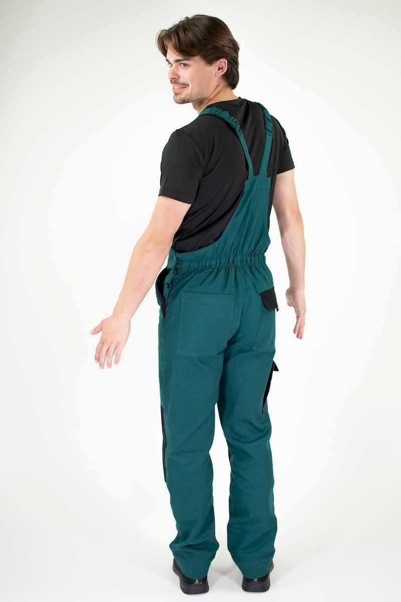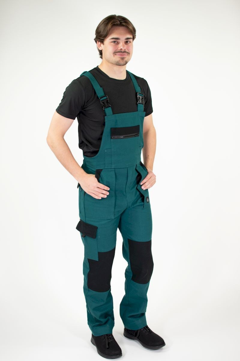 pánské pracovní kalhoty s laclem a elastickým pasem • široké šle s plastovými sponami • 2 přední kapsy, 1 stehenní kapsa • 1 velká náprsní kapsa, 2 zadní kapsy • zesílená oblast kolen • nastavitelná délka nohavic Normy: EN ISO 13688